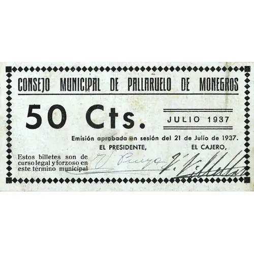 Leyenda del anverso CONSEJO MUNICIPAL DE PALLARUELO DE MONEGROS 50 Cts. JULIO 1937 Emisión aprobada en sesión del 21 de Julio de 1937. Estos billetes son de curso legal y forzoso en este término municipal