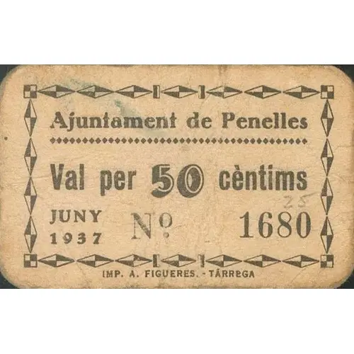 Ajuntament de Penelles Val per 50 cèntims JUNY 1937 (Translation: City Council of Penelles Valid for 50 Centimos June 1937) |