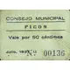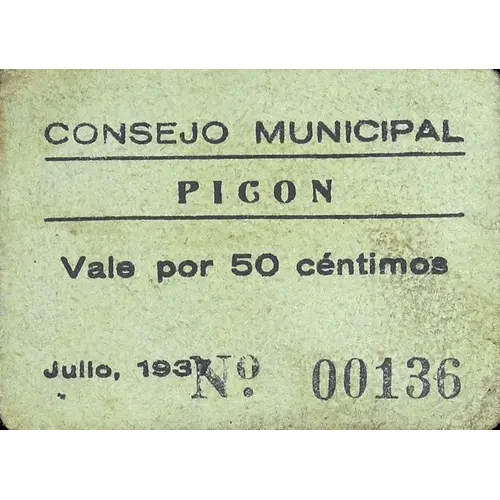 CONSEJO MUNICIPAL PICÓN Vale por 50 céntimos Julio, 1937 (Translation: Municipal Council Picón Valid for 50 Centimos July, 1937) |
