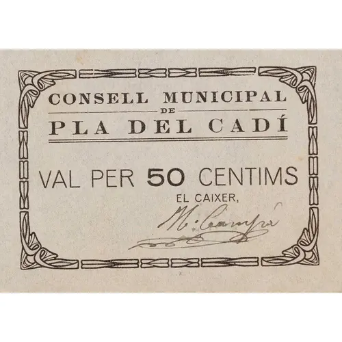 CONSELL MUNICIPAL DE PLA DEL CADÍ VAL PER 50 CENTIMS (Translation: Municipal Council of Pla del Cadí Valid for 50 centimos) |
