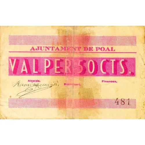 AJUNTAMENT DE POAL VAL PER 50 CTS. (Translation: City Council of Poal Valid for 50 Centimos) |