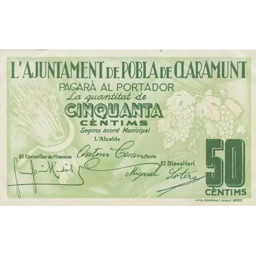 L`AJUNTAMENT DE POBLA DE CLARAMUNT PAGARÀ AL PORTADOR La quantitat de CINQUANTA CÈNTIMS Segons acord Municipal 50 CÈNTIMS (Translation: The City Council of Pobla de Claramunt Will pay the bearer The amount of Fifty Centimos According to Municipal agreement 50 Centimos) |