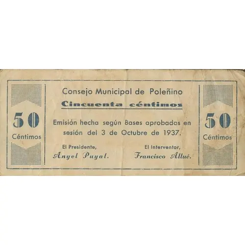 50 Céntimos Consejo Municipal de Poleñino Cincuenta céntimos Emisión hecha según Bases aprobadas en sesión del 3 de Octubre de 1937. (Translation: 50 Centimos Municipal Council of Poleñino Fifty Centimos Issue made according to Bases approved in session of October 3, 1937.) |