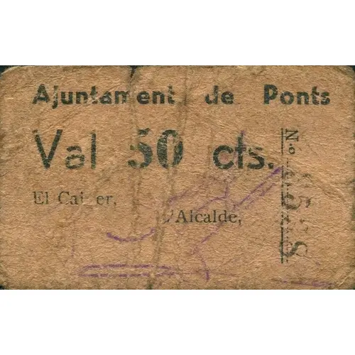 | Obverse lettering | Ajuntament de Ponts Val 50 cts. (Translation: City Council of Ponts Voucher 50 Centimos) |
