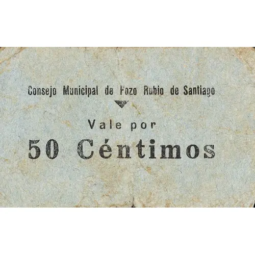 | Obverse lettering | Consejo Municipal de Pozo Rubio de Santiago Vale por 50 Céntimos (Translation: Municipal Council of Pozo Rubio de Santiago Voucher for 50 Centimos) |