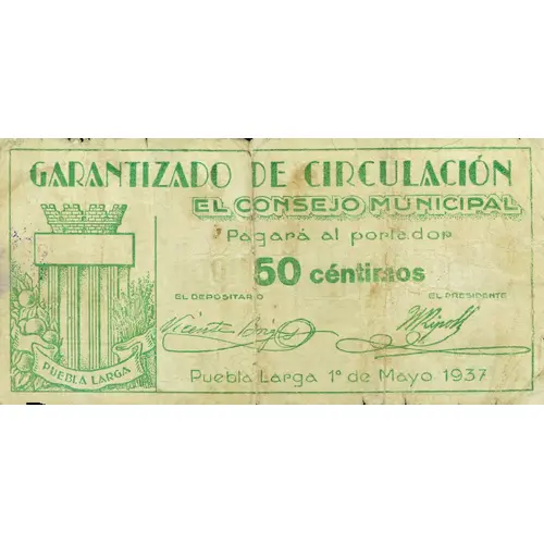 GARANTIZADO DE CIRCULACIÓN EL CONSEJO MUNICIPAL Pagará al portador 50 céntimos Puebla Larga 1º de Mayo 1937 (Translation: Guaranteed circulation The Municipal Council Will pay the bearer 50 Centimos Puebla Larga May 1, 1937) |