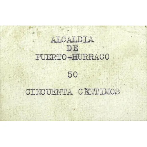 | Obverse lettering | ALCALDÍA DE PUERTO-HURRACO 50 CINCUENTA CÈNTIMOS (Translation: Mayoralty of Puerto-Hurraco Fifty Centimos) |