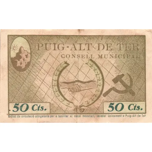 PUIG-ALT DE TER CONSELL MUNICIPAL 50 Cts. Bitllet de circulació obligatòria per a facilitar el canvi monetari, valeder únicament a Puig-Alt de Ter (Translation: Puig-Alt de Ter Municipal Council 50 Centimos Mandatory circulation banknote to facilitate currency exchange, valid only in Puig-Alt de Ter) |