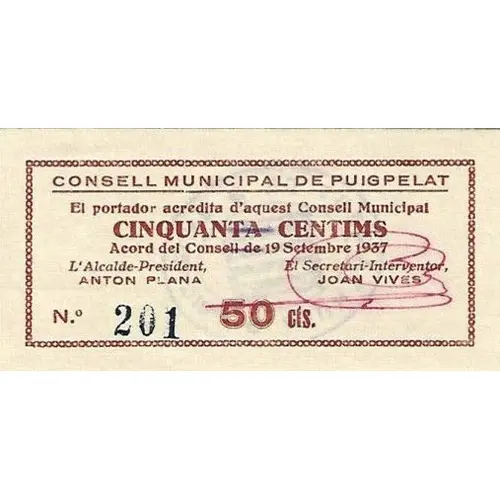 CONSELL MUNICIPAL DE PUIGPELAT El portador acredita d`aquest Consell Municipal CINQUANTA CENTIMS Acord del Consell de 19 Setembre 1937 50 cts. (Translation: Municipal Council of Puigpelat The bearer credits this Municipal Council Fifty Centimos Council agreement of September 19, 1937 50 Centimos) |