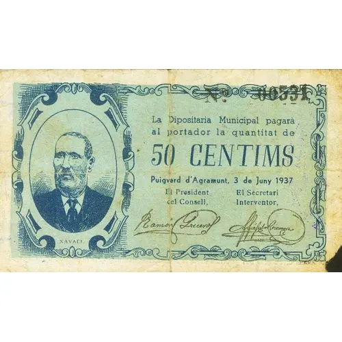 La Dipositaria Municipal pagarà al portador la quantitat de 50 CENTIMS Puigverd d`Agramunt, 3 de Juny 1937 (Translation: The Municipal Depositary will pay the bearer the amount of 50 Centimos Puigverd d`Agramunt, June 3, 1937) |