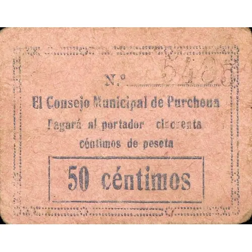 El Consejo Municipal de Purchena Pagará al portador cincuenta céntimos de peseta 50 céntimos (Translation: The Municipal Council of Purchena Will pay the bearer Fifty Centimos of peseta 50 Centimos) |