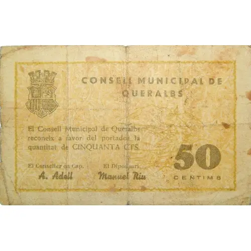 CONSELL MUNICIPAL DE QUERALBS El Consell Municipal de Queralbs reconeix a favor del portador la quantitat de CINQUANTA CTS. 50 CENTIMS (Translation: Municipal Council of Queralbs The Municipal Council of Queralbs recognizes in favor of the bearer the amount of Fifty Centimos 50 Centimos) |