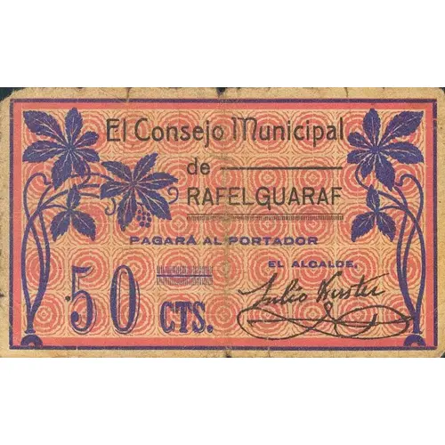 El Consejo Municipal de RAFELGUARAF PAGARÁ AL PORTADOR 50 CTS. (Translation: The Municipal Council of Rafelguaraf Will pay the bearer 50 Centimos) |