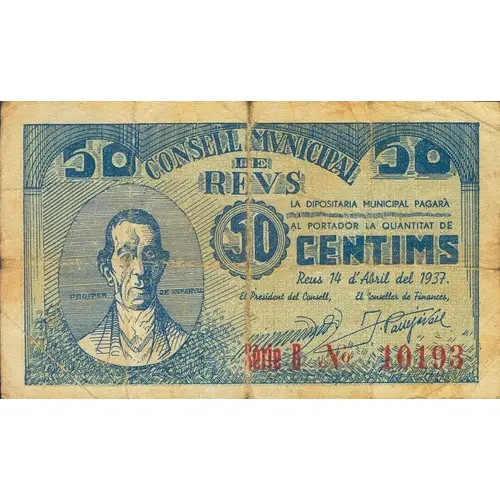 CONSELL MUNICIPAL DE REUS LA DIPOSITARIA MUNICIPAL PAGARÀ AL PORTADOR LA QUANTITAT DE 50 CENTIMS Reus 14 d`Abril del 1937. (Translation: Municipal Council of Reus The Municipal Depositary will pay the bearer the amount of 50 Centimos Reus, April 14, 1937) |