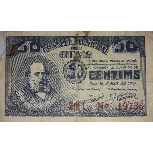 CONSELL MUNICIPAL DE REUS 50 CÈNTIMS BITLLET DE CIRCULACIÓ OBLIGATORIA EN TOTA LA JURISDICCIÓ MUNICIPAL (Translation: Municipal Council of Reus 50 Centimos Mandatory circulation banknote in all the Municipal Jurisdiction) |