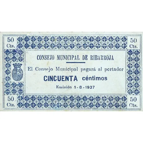 (Translation: 50 Centimos Municipal Council of Ribarroja The Municipal Council will pay the bearer Fifty Centimos Issue August 1, 1937)