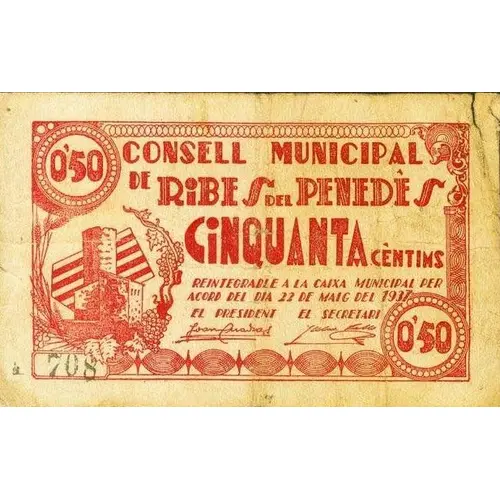 0`50 CONSELL MUNICIPAL DE RIBES DEL PENEDÈS CINQUANTA CÈNTIMS REINTEGRABLE A LA CAIXA MUNICIPAL PER ACORD DEL DIA 22 DE MAIG DEL 1937 (Translation: Municipal Council of Ribes del Penedès Fifty Centimos Reintegratable to the Municipal Treasury by agreement of May 22, 1937.) |