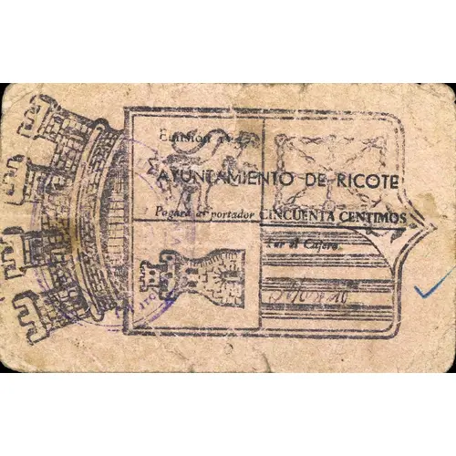 Emisión 1937 AYUNTAMIENTO DE RICOTE Pagará al portador CINCUENTA CENTIMOS (Translation: Issue 1937 City Council of Ricote Will pay the bearer Fifty Centimos) |