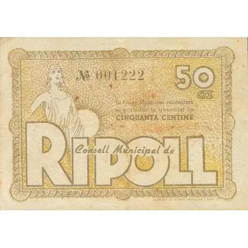 50 CTS. La Caixa Municipal reintegrarà al portador la quantitat de CINQUANTA CENTIMS Consell Municipal de RIPOLL (Translation: 50 Centimos The Municipal Treasury will reimburse the bearer the amount of Fifty Centimos Municipal Council of Ripoll) |