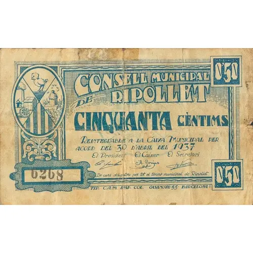 CONSELL MUNICIPAL DE RIPOLLET CINQUANTA CÈNTIMS REINTEGRABLE A LA CAIXA MUNICIPAL PER ACORD DEL 30 D`ABRIL DEL 1937 De curs obligatori per tot el terme municipal de Ripollet (Translation: Municipal Council of Ripollet Fifty Centimos Refundable to the `Caixa Municipal` by agreement of April 30, 1937 Of mandatory course in all the Municipal term of Ripollet) |