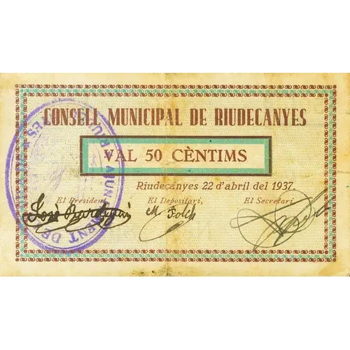 (Translation: 50 Centimos The Municipal Council of Riudecanyes will make the amount of these Vouchers effective upon presentation of the same for a value equivalent to that of the legal tender banknotes in Catalonia.)