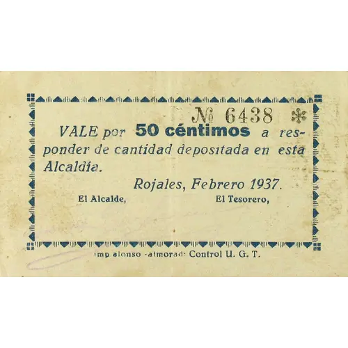 VALE por 50 céntimos a responder de cantidad depositada en esta Alcaldía. Rojales, Febrero 1937. (Translation: Voucher for 50 Centimos to respond to the amount deposited in this Mayoralty. Rojales, February 1937.) |