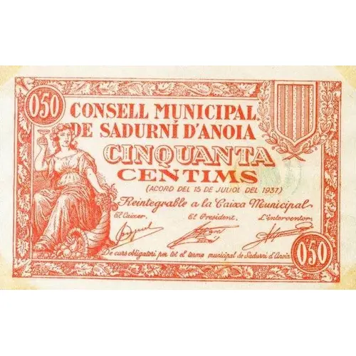 0`50 CONSELL MUNICIPAL DE SADURNÍ D`ANOIA CINQUANTA CENTIMS (ACORD DEL 15 DE JULIOL DEL 1937) Reintegrable a la Caixa Municipal De curs obligatori per tot el terme municipal de Sadurní d`Anoia (Translation: Municipal Council of Sadurní d`Anoia Fifty Centimos (Agreement of July 15, 1937) Redeemable at the Municipal Treasury Mandatory course for the entire municipality of Sadurní d`Anoia) |