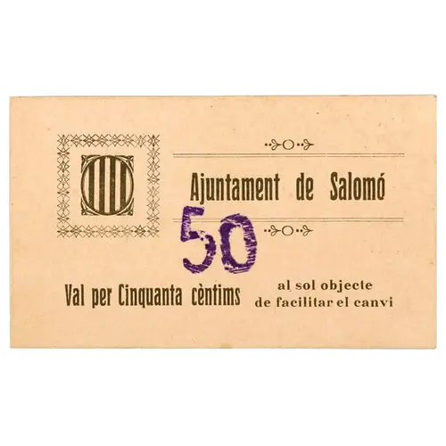 Ajuntament de Salomó 50 Val per Cinquanta cèntims al sol objecte de facilitar el canvi (Translation: City Council of Salomó Value for Fifty Centimos For the sole purpose of facilitating change) |
