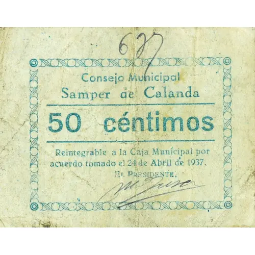 Consejo Municipal Samper de Calanda 50 céntimos Reintegrable a la Caja Municipal por acuerdo tomado el 24 de abril de 1937. (Translation: Municipal Council Samper de Calanda 50 Centimos Reimbursable to the Municipal Fund, by agreement made on April 24, 1937.) |