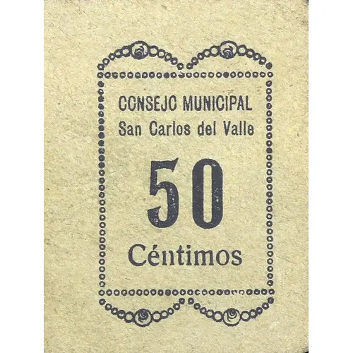 | Obverse lettering | CONSEJO MUNICIPAL San Carlos del Valle 50 Céntimos (Translation: Municipal Council San Carlos del Valle 50 Centimos) |