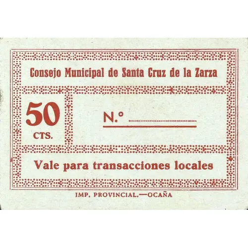 Consejo Municipal de Santa Cruz de la Zarza 50 Cts. Vale para transacciones locales IMP. PROVINCIAL. - OCAÑA (Translation: Municipal Council of Santa Cruz de la Zarza 50 Centimos Voucher for local transactions) |