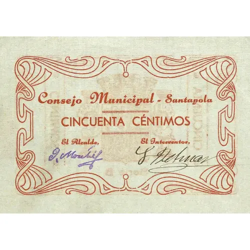 | Obverse lettering | Consejo Municipal - Santapola CINCUENTA CÉNTIMOS (Translation: Municipal Council - Santapola Fifty Centimos) |