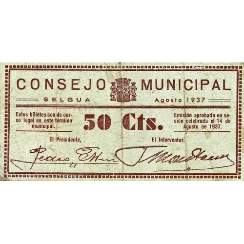 CONSEJO MUNICIPAL SELGUA / Agosto 1937 50 Cts. Estos billetes son de curso legal en este término municipal. Emisión aprobada en sesión celebrada el 14 de Agosto de 1937. (Translation: Municipal Council Selgua / August 1937 50 Centimos These banknotes are legal tender in this municipal term. Issue approved in session held on August 14, 1937.) |