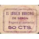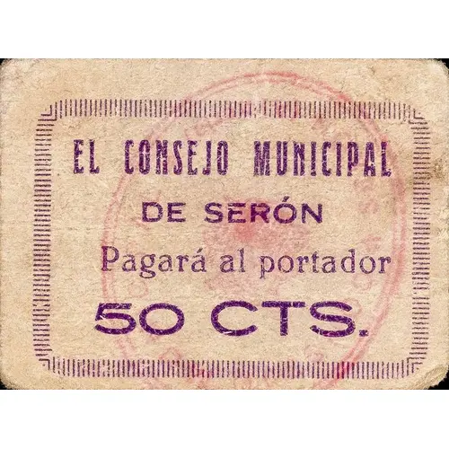 EL CONSEJO MUNICIPAL DE SERÓN Pagará al portador 50 CTS. (Translation: The Municipal Council of Serón Will pay the bearer 50 Centimos) |