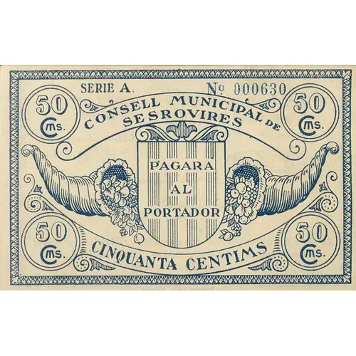 50 Cms. CONSELL MUNICIPAL DE SESROVIRES PAGARÁ AL PORTADOR CINQUANTA CENTIMS (Translation: 50 Centimos Municipal Council of Sesrovires Will pay the bearer Fifty Centimos) |