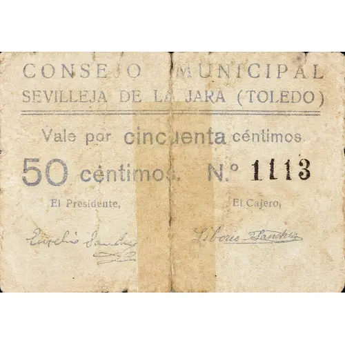 | Obverse lettering | CONSEJO MUNICIPAL DE SEVILLEJA DE LA JARA (TOLEDO) Vale por cincuenta céntimos. 50 céntimos. (Translation: Municipal Council of Sevilleja de la Jara (Toledo) Voucher for Fifty Centimos 50 Centimos) |