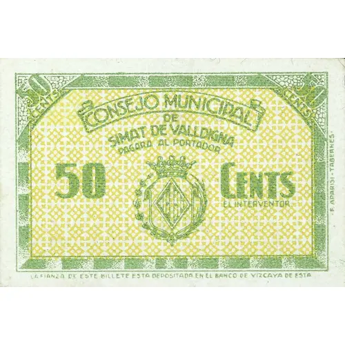 50 CENTS CONSEJO MUNICIPAL DE SIMAT DE VALLDIGNA PAGARA AL PORTADOR 50 CENTS LA FIANZA DE ESTE BILLETE ESTA DEPOSITADA EN EL BANCO DE VIZCAYA DE ESTA (Translation: 50 Centimos Municipal Council of Simat de Valldigna Will pay the bearer 50 Centimos The deposit for this note is deposited in the local Bank of Biscay) |