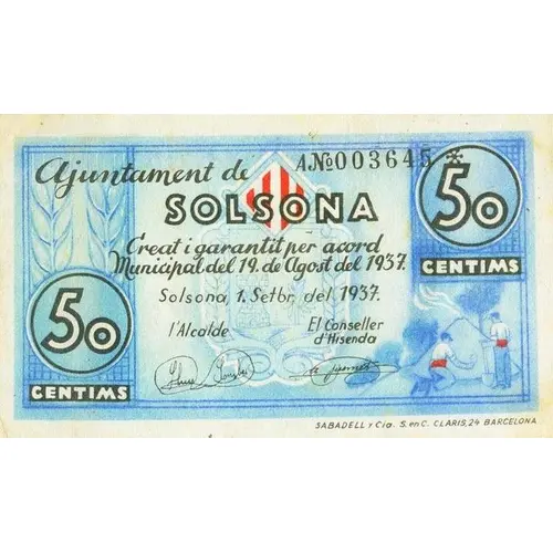 Ajuntament de SOLSONA 50 CENTIMS Creat i garantit per acord Municipal del 19. de Agost del 1937 Solsona, 1. Setbr. del 1937 (Translation: City Council of Solsona 50 Centimos Created and guaranteed by Municipal agreement of August 19, 1937 Solsona, September 1, 1937) |