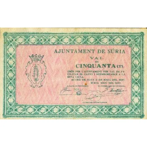 AJUNTAMENT DE SÚRIA VAL DE CINQUANTA CTS. EMÈS PER L`AJUNTAMENT PER TAL DE FACILITAR EL CANVI I REEMBORSABLE A LA SEVA CAIXA ACORD DE DATA 3 DE MAIG DEL 1937. SÚRIA, MAIG DEL 1937. (Translation: City Council of Súria Voucher of Fifty Centimos Issued by the City Council to facilitate exchange and refundable at its `Caixa` Agreement dated May 3, 1937. Súria, May 1937.) |
