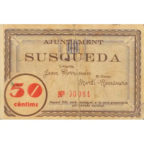 Emissió acordada el 15 d`Agost del 1937 de curs obligatori a Susqueda 50 cèntims (Translation: Issuance agreed on August 15, 1937 mandatory course in Susqueda 50 Centimos) |
