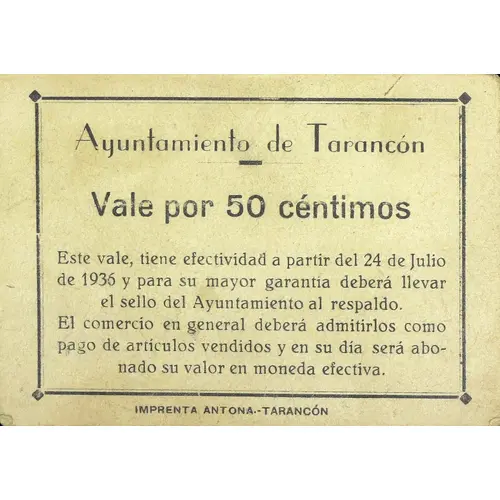 (Translation: City Council of Tarancón Voucher for 50 Centimos This Voucher is effective as of July 24, 1936 and for greater guarantee it must bear the seal of the City Council on the back. Commerce in general must accept them as payment for items sold and their value in effective currency will be paid on the day.)