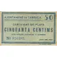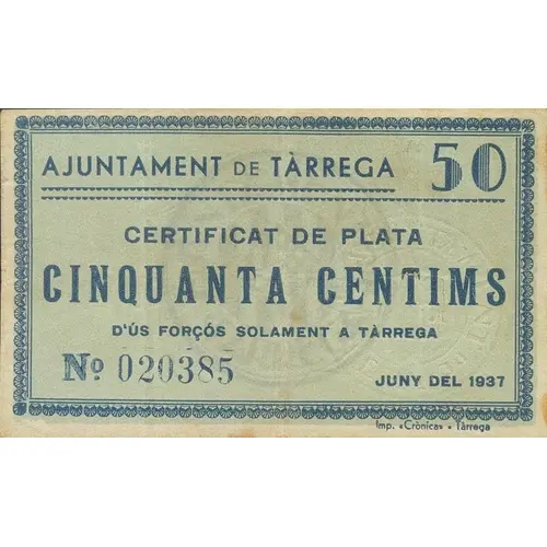 50 AJUNTAMENT DE TÀRREGA CERTIFICAT DE PLATA CINQUANTA CENTIMS D`ÚS FORÇÓS SOLAMENT A TÀRREGA JUNY DEL 1937 (Translation: City Council of Tàrrega Silver Certificate Fifty Centimos of forced use only in Tàrrega June 1937) |