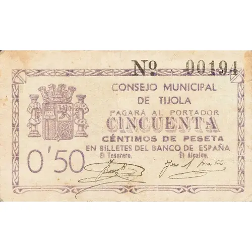 CONSEJO MUNICIPAL DE TIJOLA PAGARA AL PORTADOR CINCUENTA CÉNTIMOS DE PESETA EN BILLETES DEL BANCO DE ESPAÑA 0`50 (Translation: Municipal Council of Tíjola Will pay the bearer Fifty Centimos of Peseta in banknotes of the Bank of Spain) |