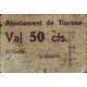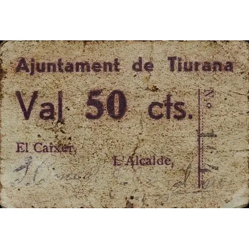 | Legenda del dritto | Ajuntament de Tiurana Val 50 cts. (Translation: City Council of Tiurana Voucher 50 Centimos) |