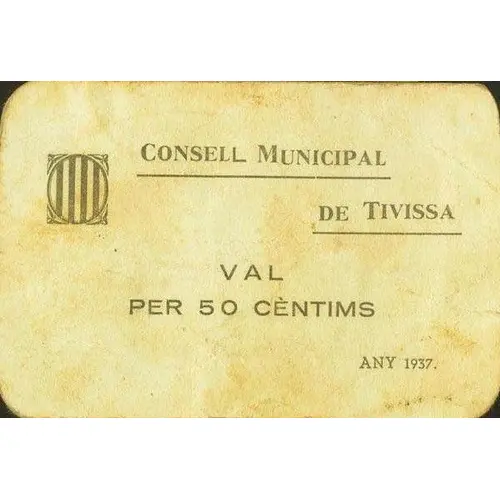 CONSELL MUNICIPAL DE TIVISSA VAL PER 50 CÈNTIMS ANY 1937. (Translation: Municipal Council of Tivissa Valid for 50 Centimos Year 1937.) |