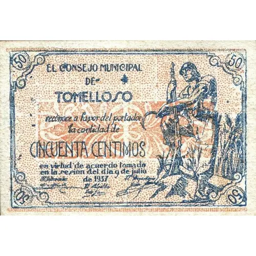 50 EL CONSEJO MUNICIPAL DE TOMELLOSO reconoce a favor del portador la cantidad de CINCUENTA CENTIMOS. en virtud de acuerdo tomado en la sesión del día 9 de julio de 1937 (Translation: The Municipal Council of Tomelloso recognizes in favor of the bearer the amount of Fifty Centimos. by virtue of the agreement taken in the session of July 9, 1937) |