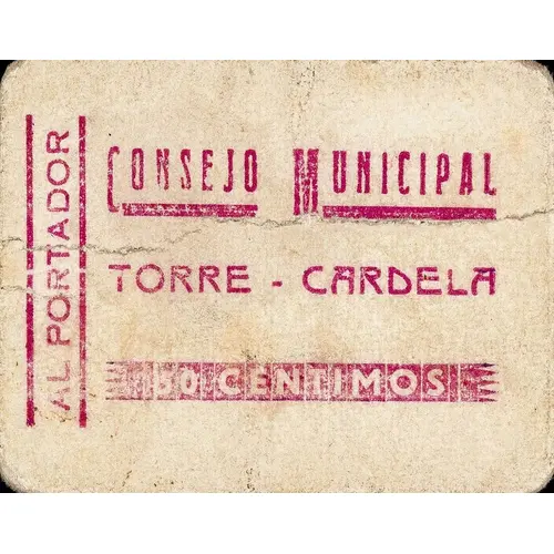| Obverse lettering | CONSEJO MUNICIPAL TORRE-CARDELA AL PORTADOR 50 CENTIMOS (Translation: Municipal Council Torre-Cardela To the bearer 50 Centimos) |