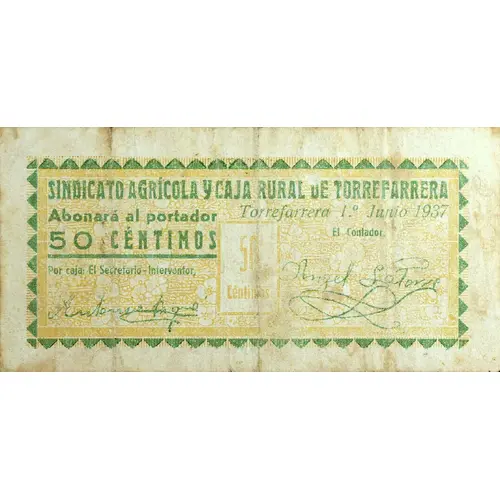 SINDICATO AGRÍCOLA Y CAJA RURAL DE TORREFARRERA Abonará al portador 50 CÉNTIMOS Torrefarrera 1.º Junio 1937 Por caja: El Secretario-Interventor, El Contador, (Translation: Agricultural Union and Rural Fund of Torrefarrera Will pay the bearer 50 Centimos Torrefarrera June 1, 1937 Per fund: The Secretary-Auditor, The Accountant,) |