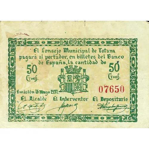 (Translation: The Municipal Council of Totana will pay the bearer, in banknotes of the Bank of Spain, the amount of 50 Centimos Issue May 16, 1937.)