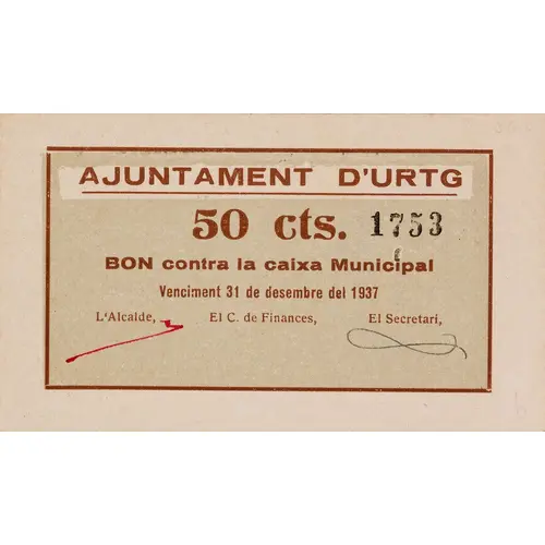 AJUNTAMNENT D`URTG 50 cts. BON contra la caixa Municipal Venciment 31 de desembre del 1937 (Translation: City Council of Urtg 50 Centimos Bond against the Municipal Fund Expiration December 31, 1937) |